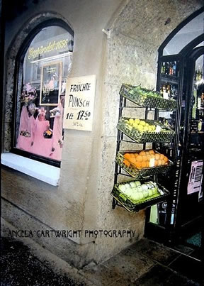 A market selling fruit in the Getreidegasse old town Salzburg, Austria Photograph handpainted with oils Appears in the book "Mixed Emulsions" by Angela Cartwright